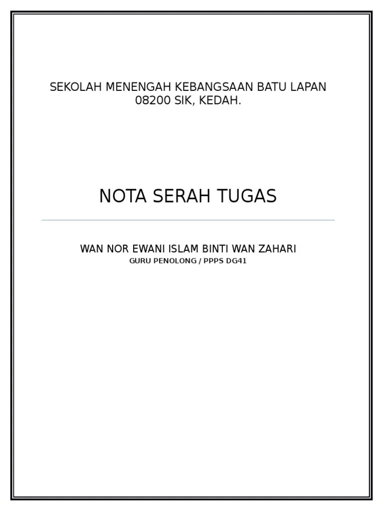 Jalan kenanga 31350 ipoh, perak dr tuan, penyerahan tugas guru penolong ppp. Nota serah tugas (i) adalah saya muhammad asadi bin bahari (no. Surat penyerahan dan akuan terima nota serah tugas. Surat penyerahan dan akuan terima nota .